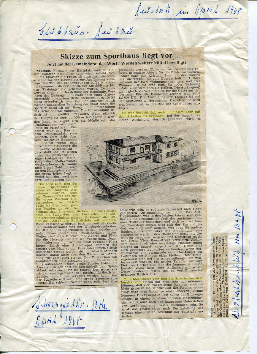 Aus dem FC Neustadt Archiv hier ein Artikel zum "neuen" Sporthaus aus dem Schwarzwälder Boten vom April 1960!